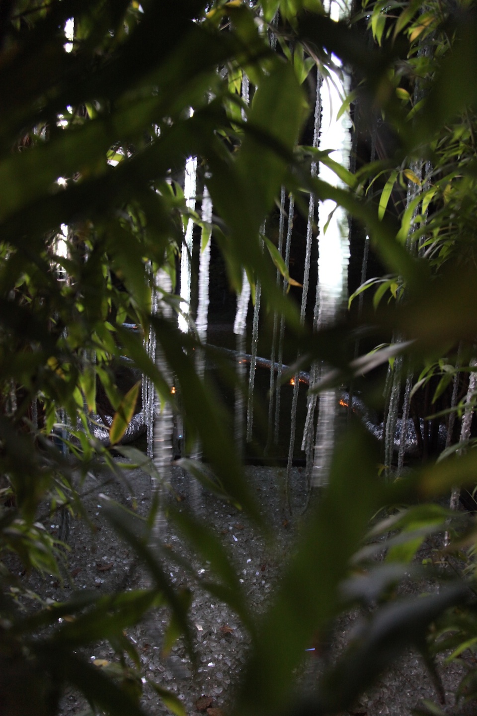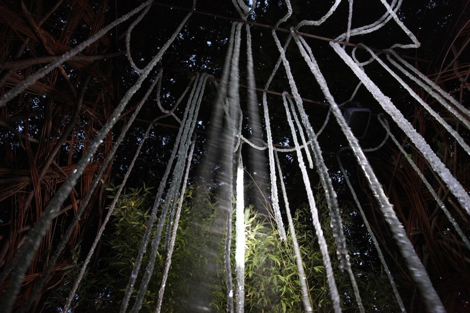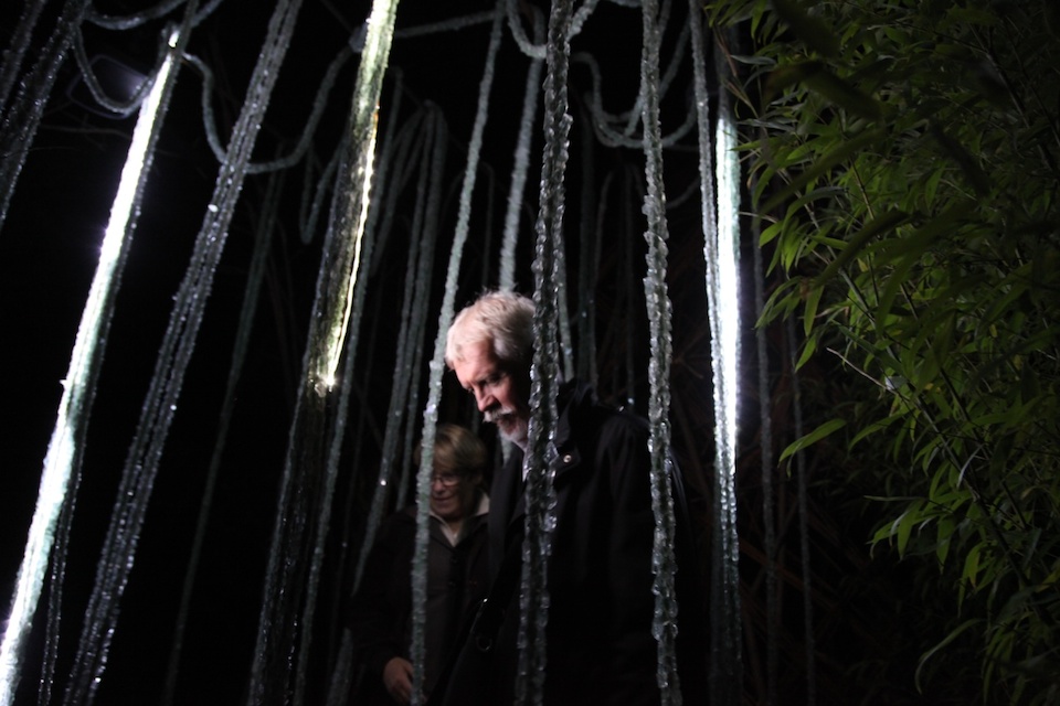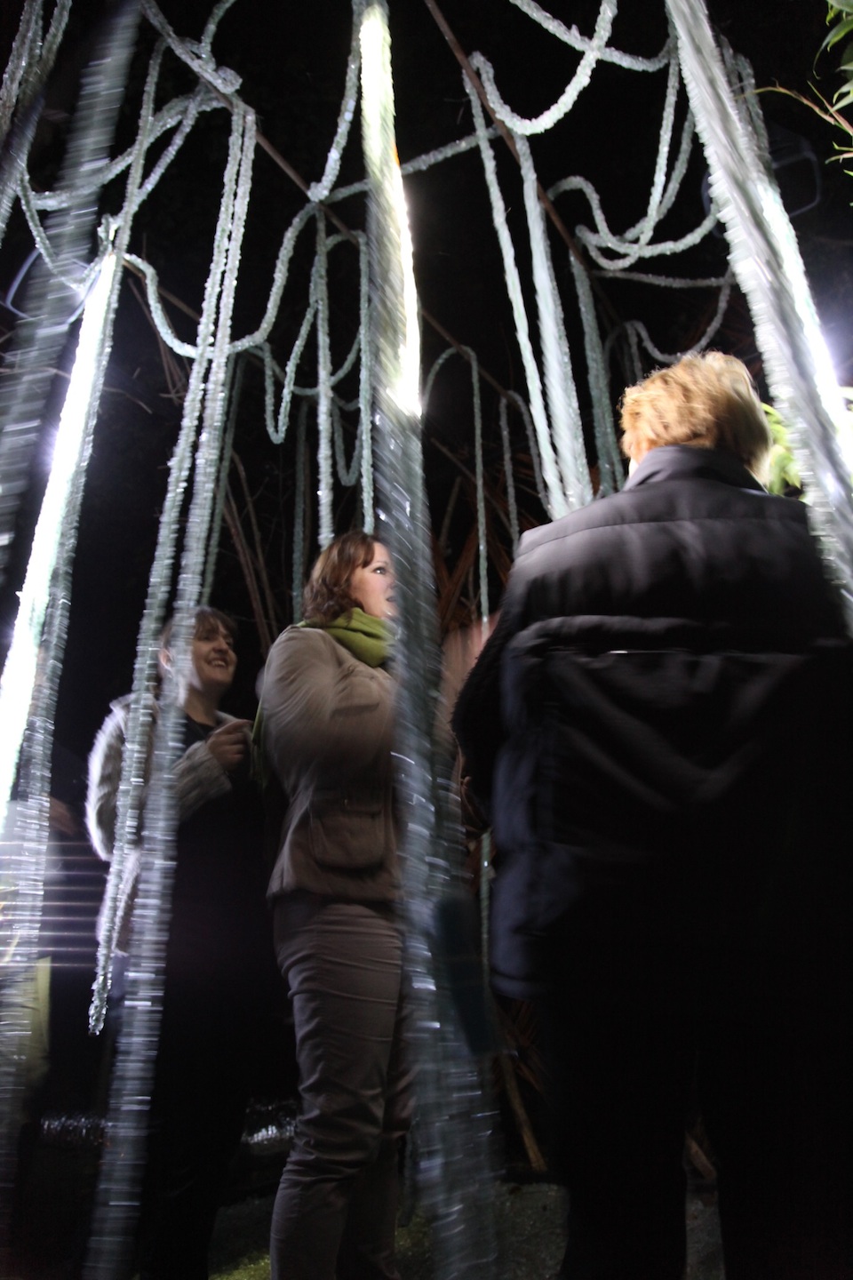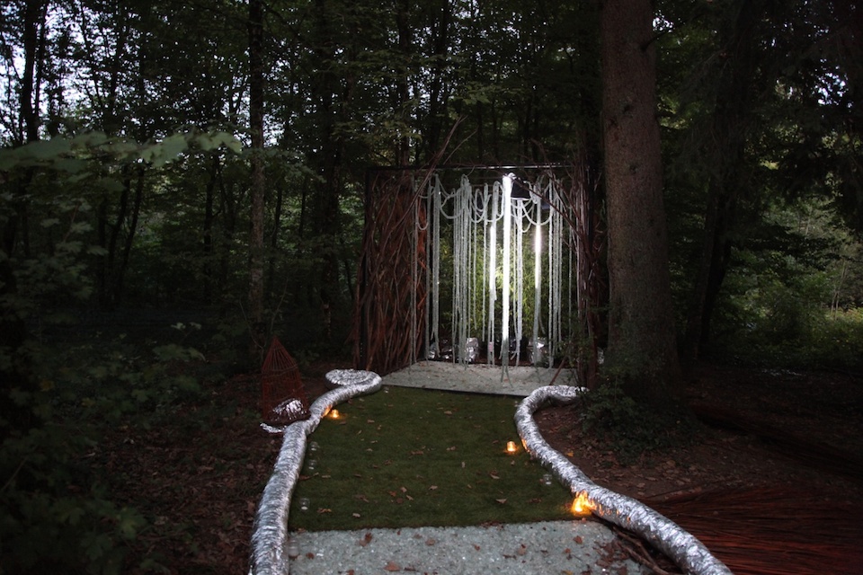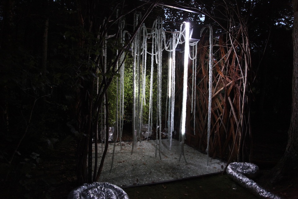 Verre recyclé, silicone, cordes de cocos, tubulaires en acier, branches de bois, gazon naturel, lumière en Leeds, aluminium, haut-parleur et capteurs.