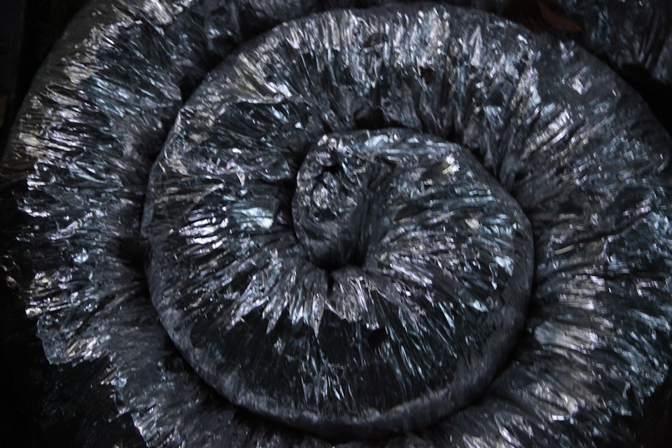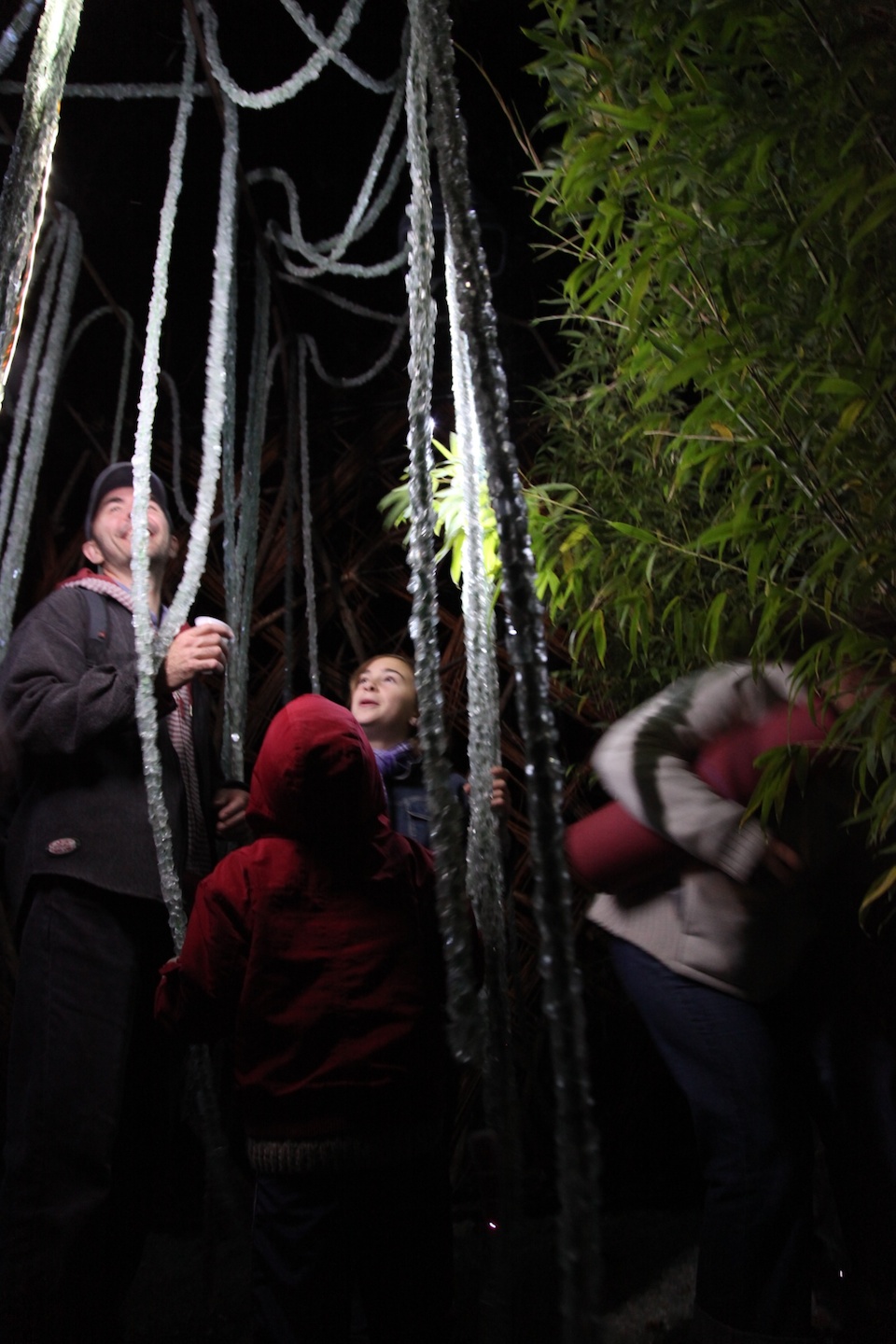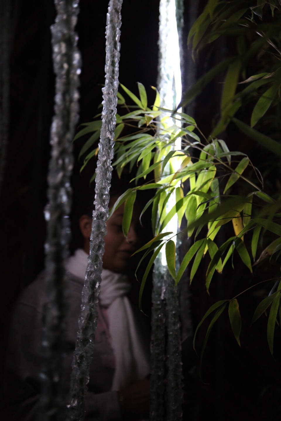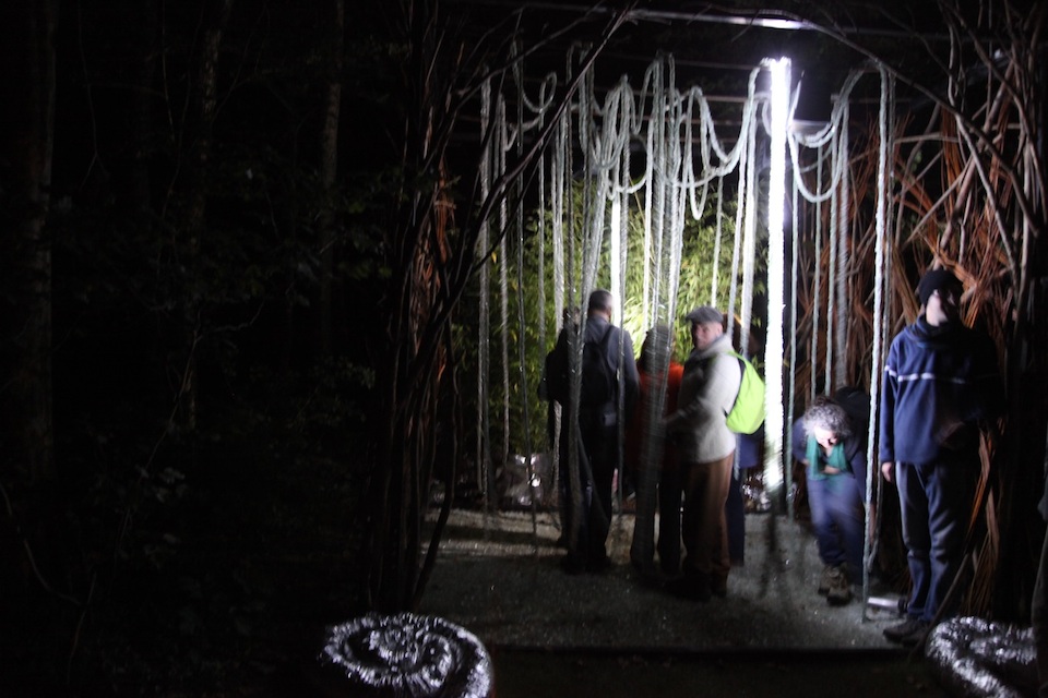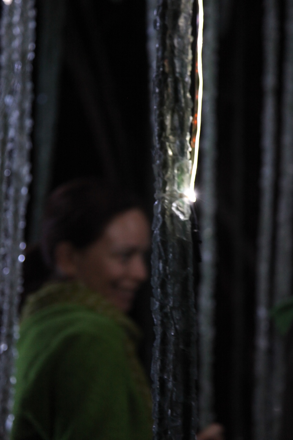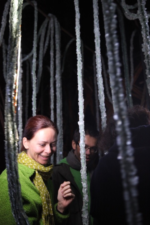 Verre recyclé, silicone, cordes de cocos, tubulaires en acier, branches de bois, gazon naturel, lumière en Leeds, aluminium, haut-parleur et capteurs.