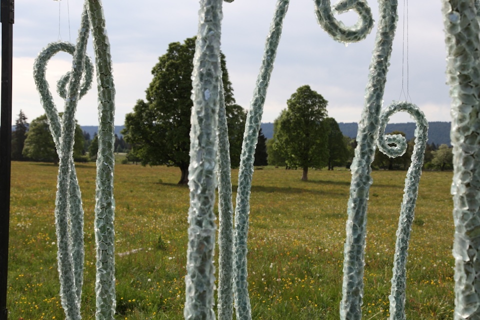 Verre recyclé, silicone, cordes de cocos, tubulaires en acier.