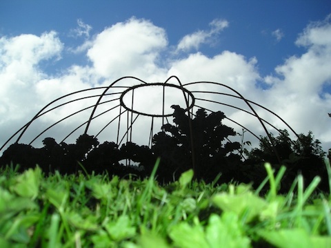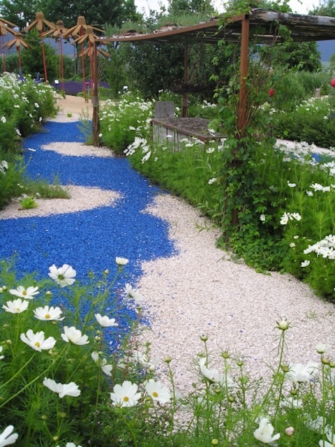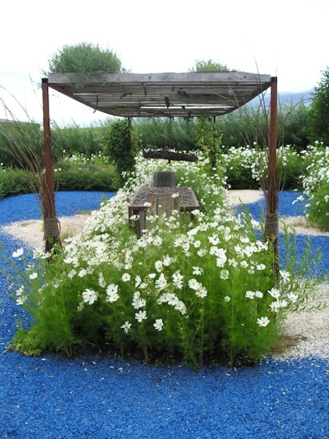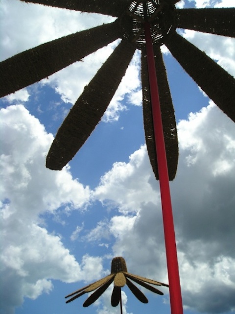 De leur côté les Jardiniers de l'Extraordinaires ont composé à cette enseigne une palette de onze parcelles, chacune dédiée à une couleur : jaune, noir, vert, bleu, orange, rouge, blanc, rose, violet, brun. Ils n'y ont pas semé et planté que des végétaux aux noms de rêve, cytise ou irésine, gypsophile ou alchémille, ipomea purpurea ou caryopteris clandonensis. Ils y ont accroché aussi des créations matérielles et verbales surprenantes et attachantes : Fleurs d'ombre, fronde de fougère, couveuse de chou, libellule en vol, œuf perché, nuage en pergola…On peut même en faire l'acquisition, avis aux amateurs! Le parcours de visite est balisé de fleurs de coco tissées caressant le ciel. Chacun des noms de ces parcelles est à lui seul une invitation à la découverte, à l'évasion : Vivaces en liberté, Le murmure d'un chou fécondé, Eclosion en fougères, Immortel cube, La spirale de bois, La vengeance du rouge Gorge, Un nuage de fleurs, Chemin faisant au ras de l'eau ou Seule une libellule s'y aventurerait pour y trouver son amour, A fleurs de ciel.