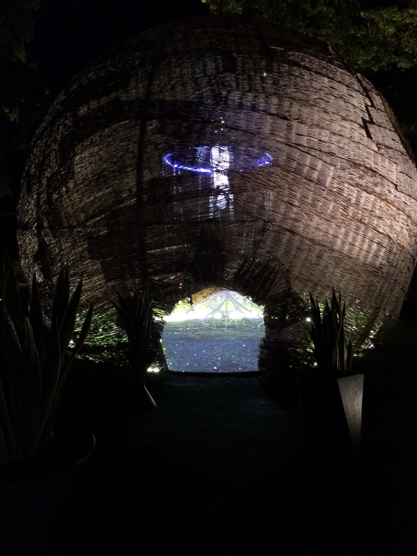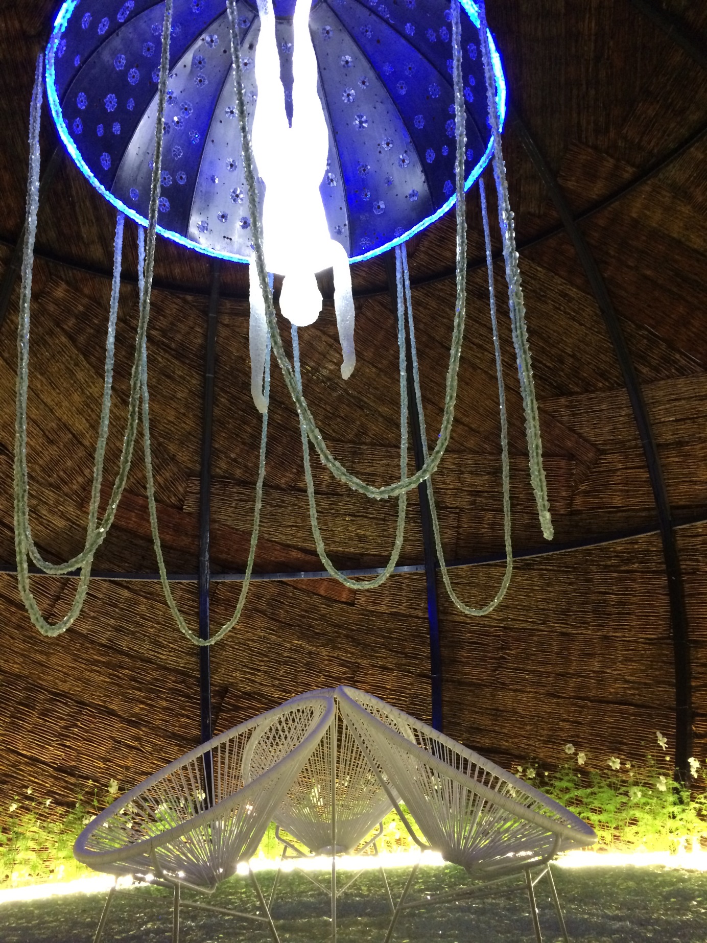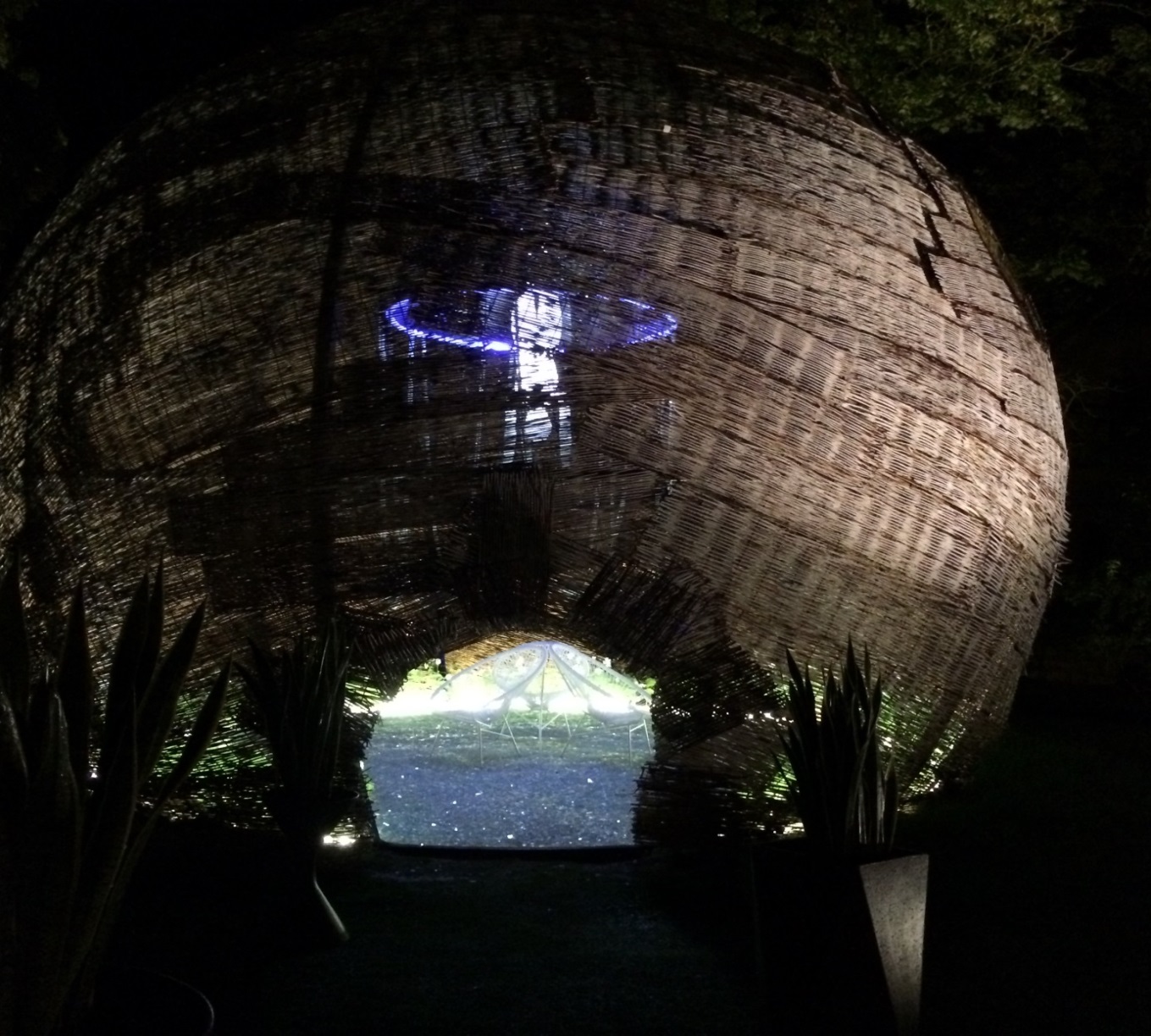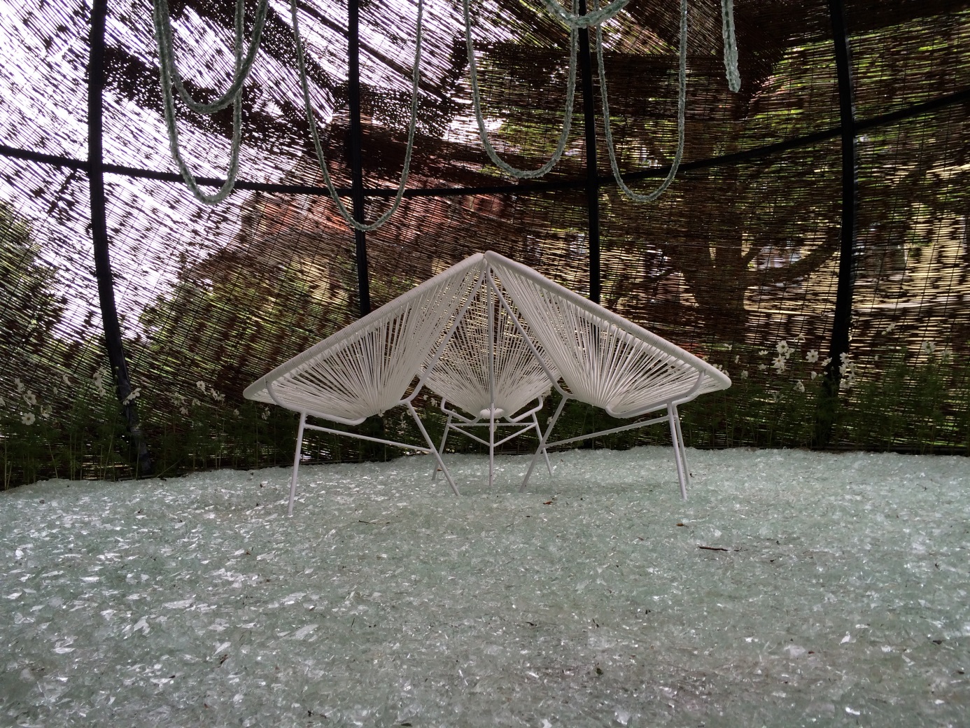 Grillage en acier, Saules en vannerie tressés durant 3 mois, peinture, béton, terre végétale, gazon, sable lunaire, drapeau, cabane en bois, haut-parleurs et câbles électriques, mannequin en verre, verre recyclé, led lumière, sièges design, pots de fleurs.