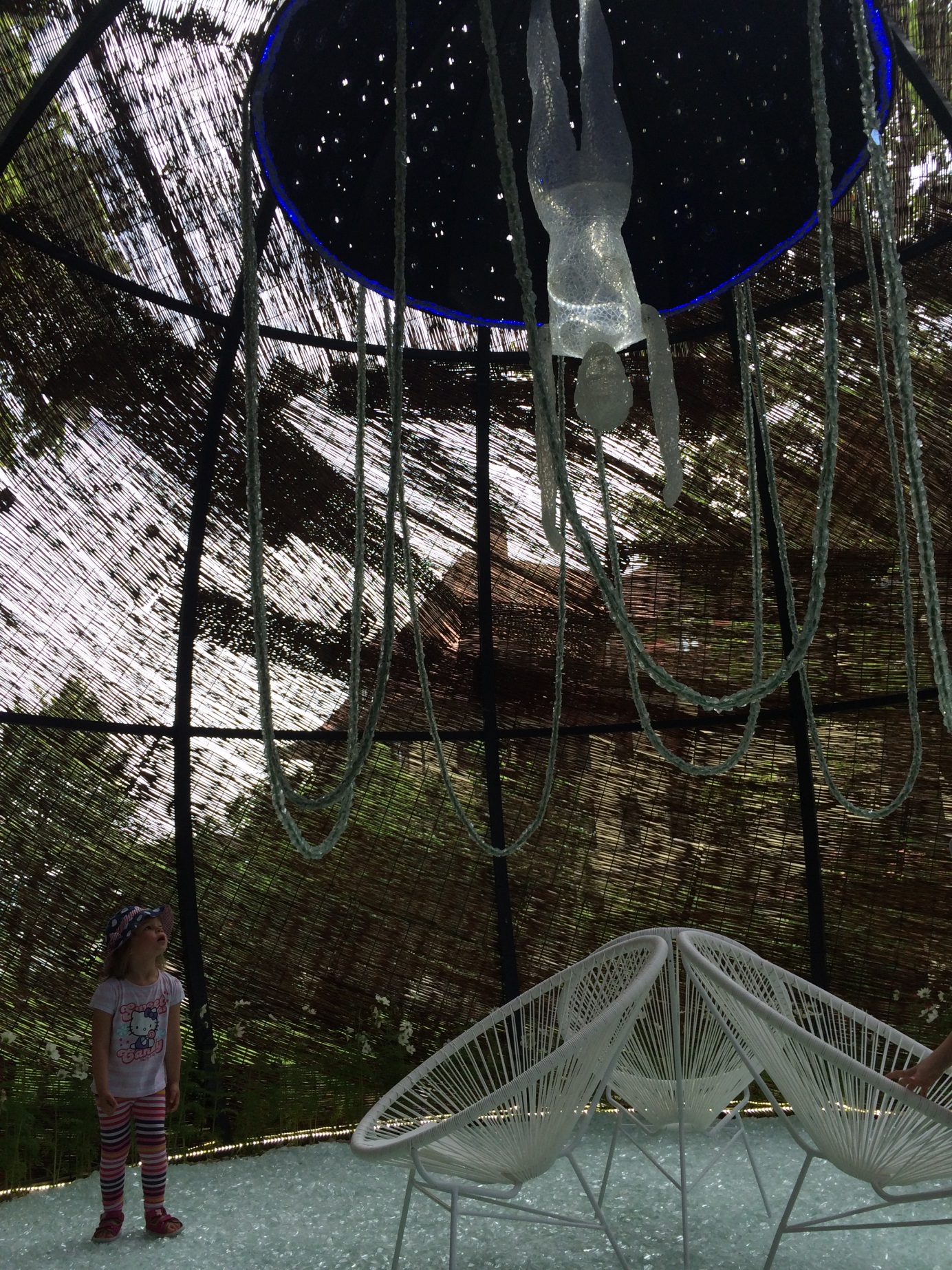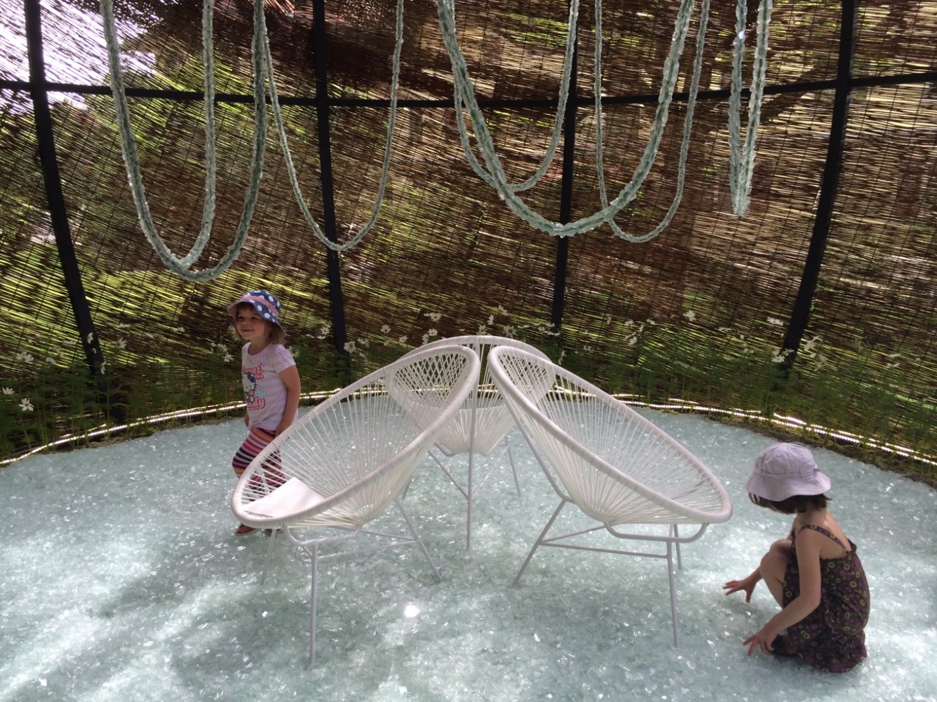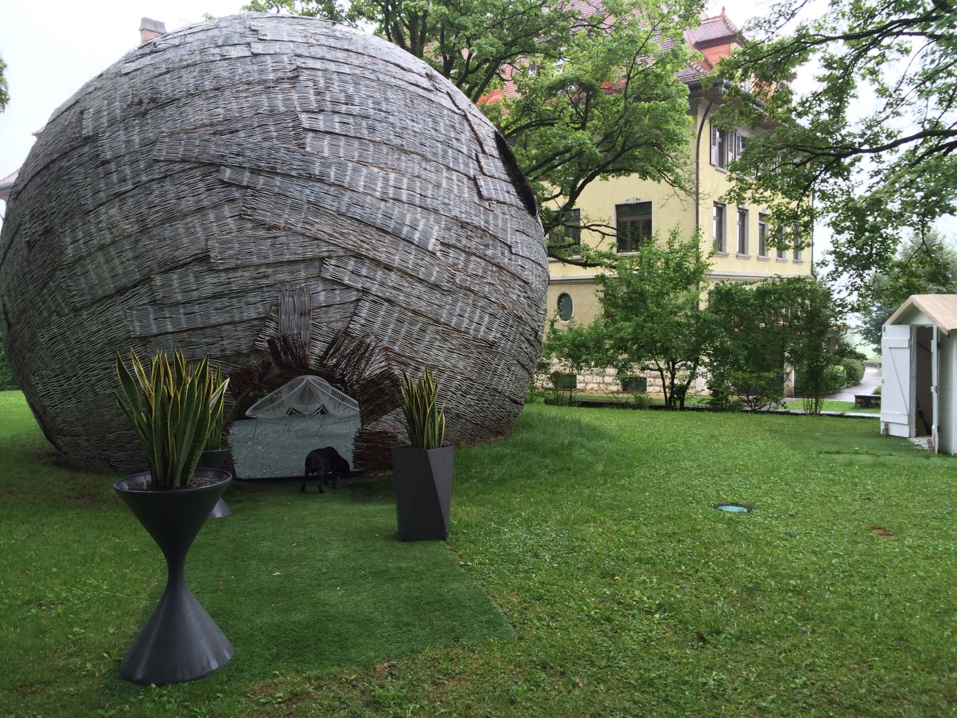Grillage en acier, Saules en vannerie tressés durant 3 mois, peinture, béton, terre végétale, gazon, sable lunaire, drapeau, cabane en bois, haut-parleurs et câbles électriques, mannequin en verre, verre recyclé, led lumière, sièges design, pots de fleurs.
