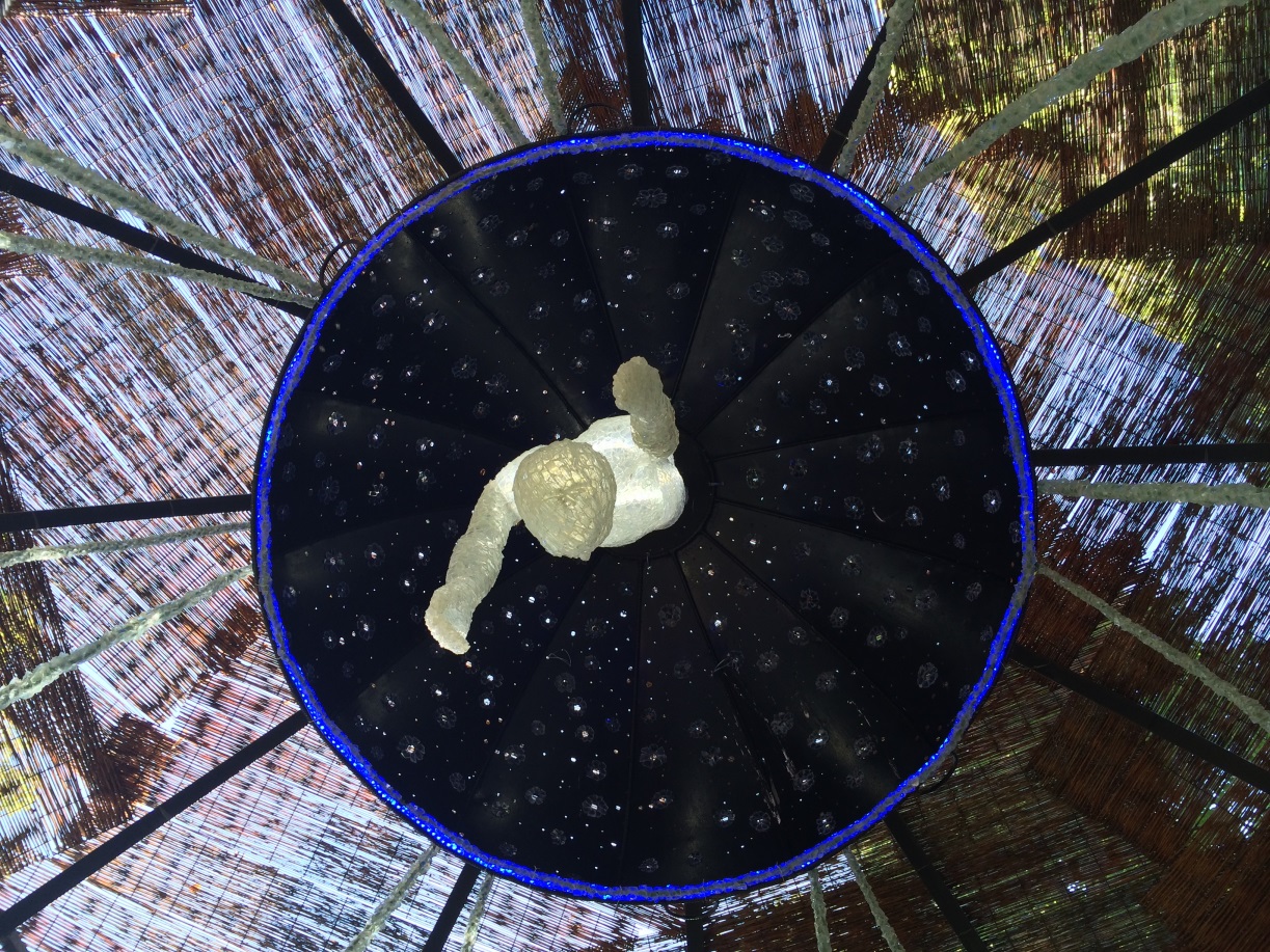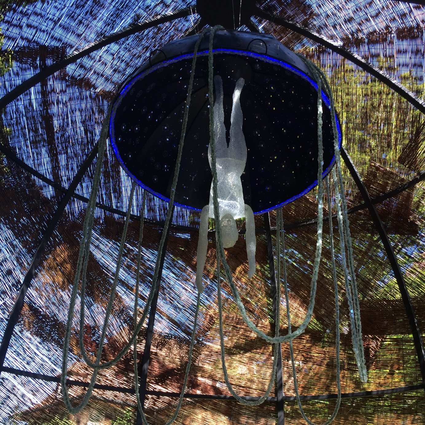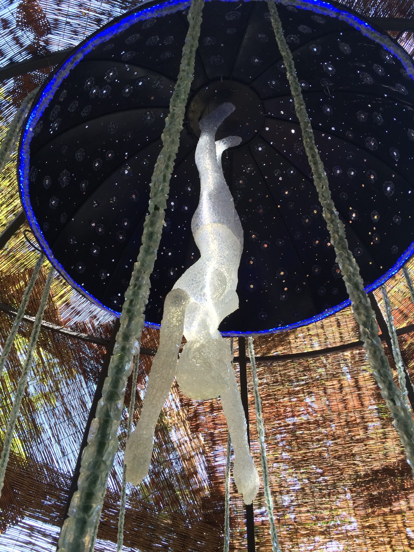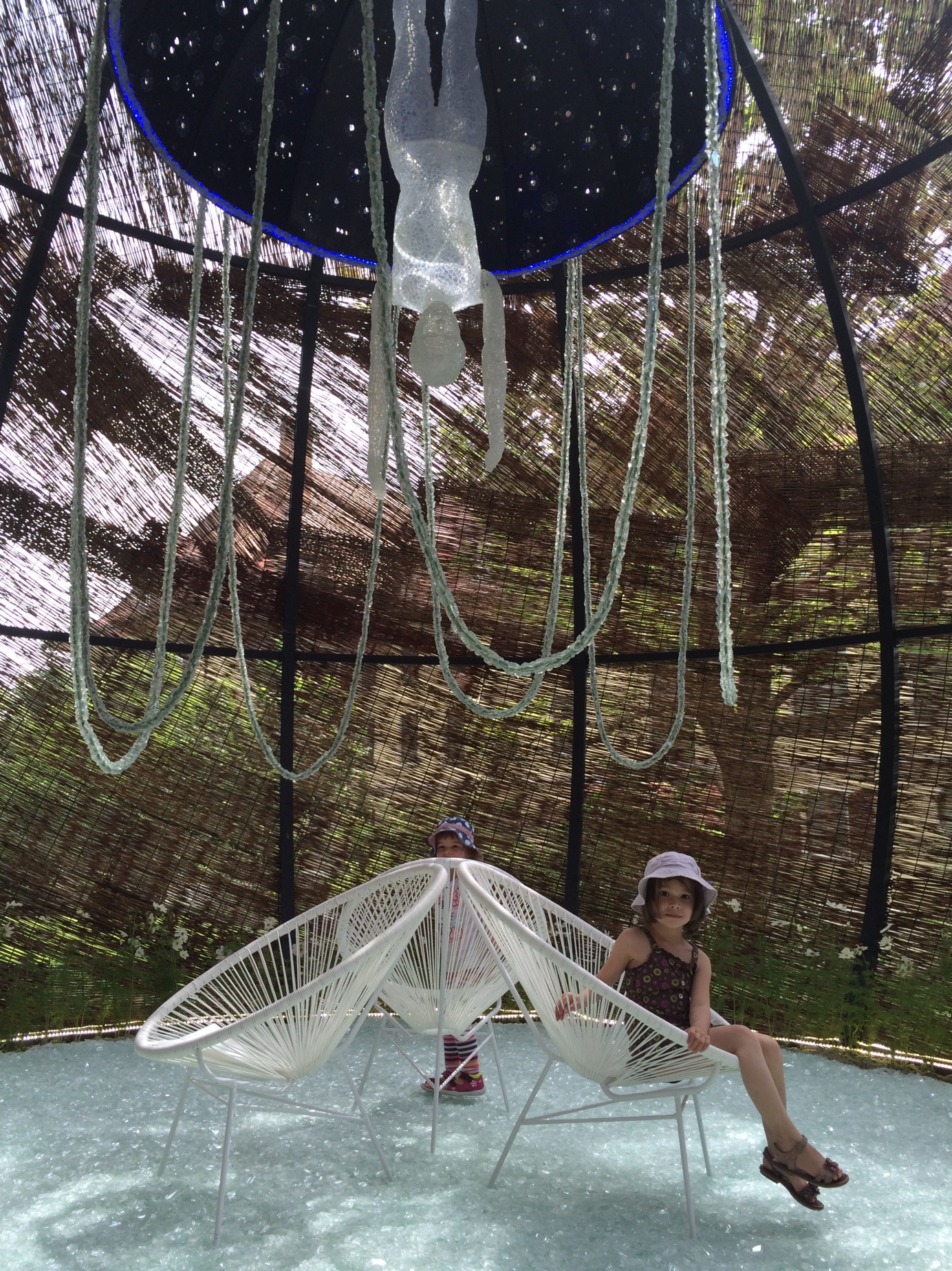 Grillage en acier, Saules en vannerie tressés durant 3 mois, peinture, béton, terre végétale, gazon, sable lunaire, drapeau, cabane en bois, haut-parleurs et câbles électriques, mannequin en verre, verre recyclé, led lumière, sièges design, pots de fleurs.