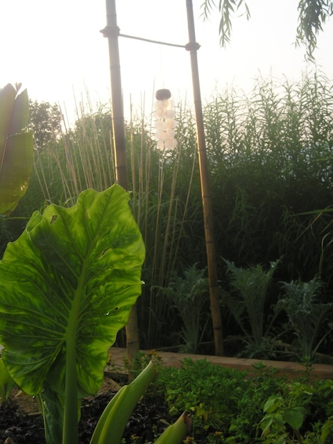 Paille, fleurs annuelles, arbres, arbustes, semis de fleurs, eau, lumière, fers à béton, bois, gravier, cocos, ferraille, peinture, terre végétale, composte d'Evologia, gazon, dalles en granit, pots en plastique.