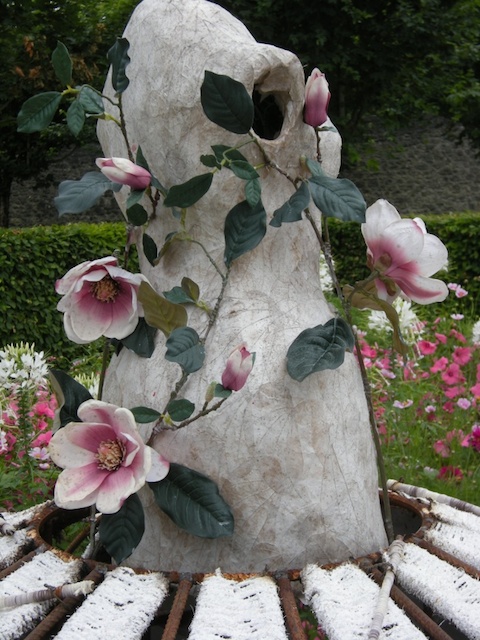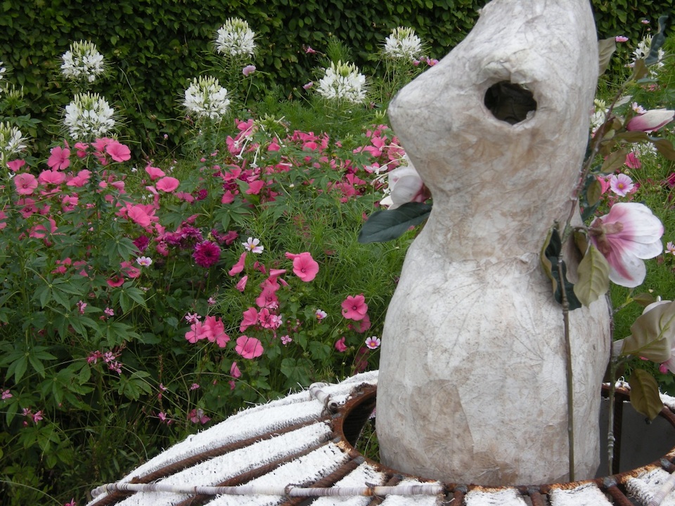 Mannequin en polyester, fers à béton, feuilles de papiers fleuris, graviers, galets, copaux, planches en bois.