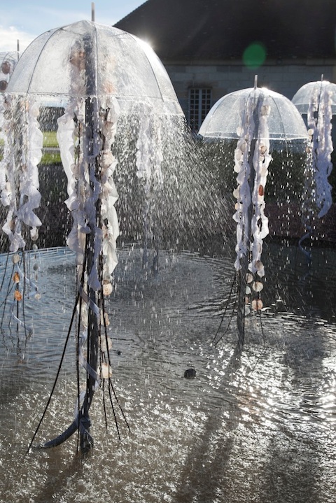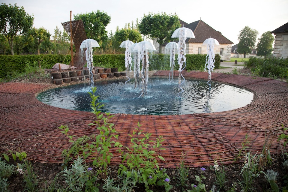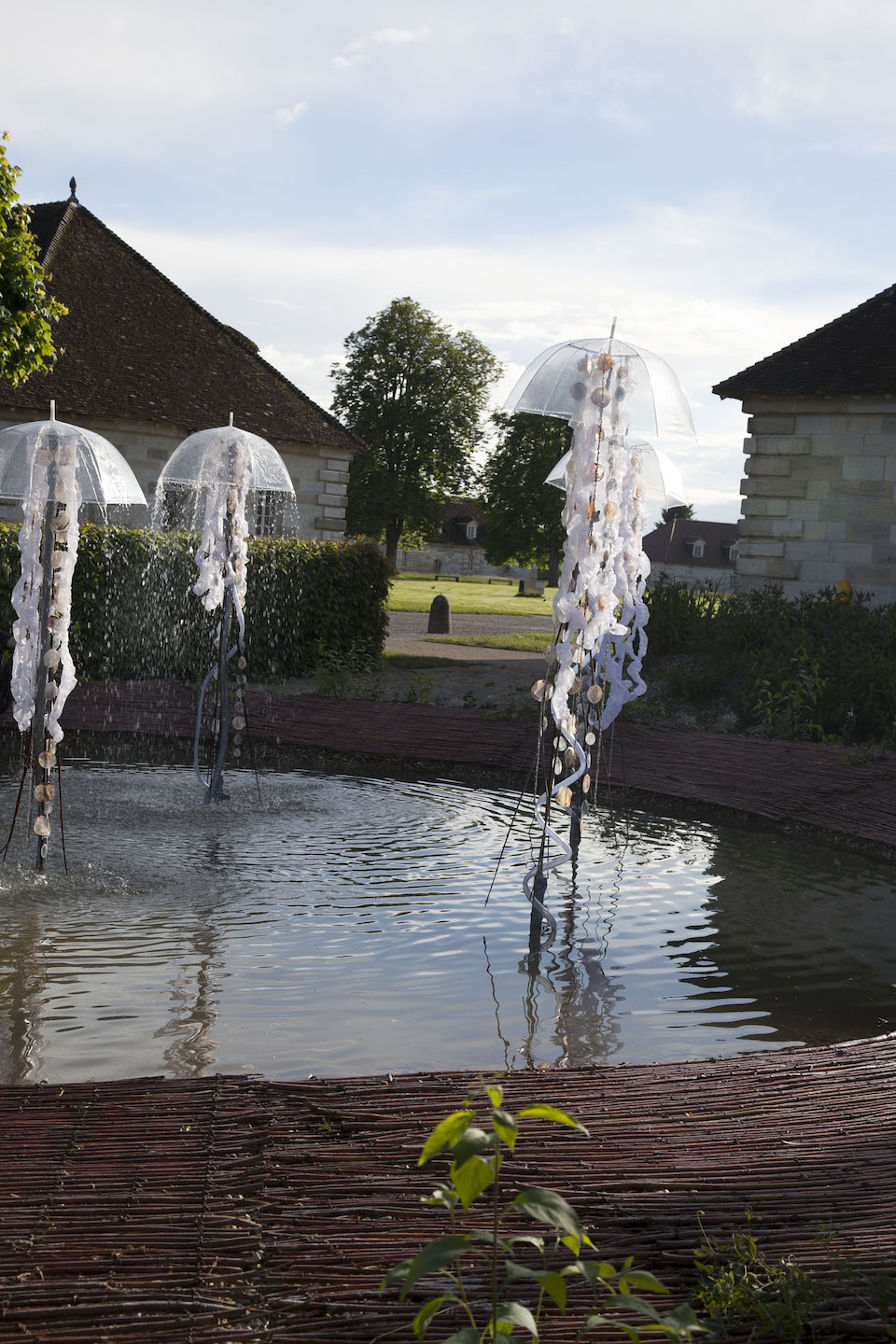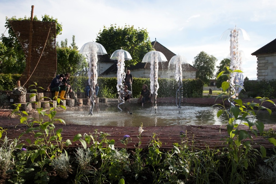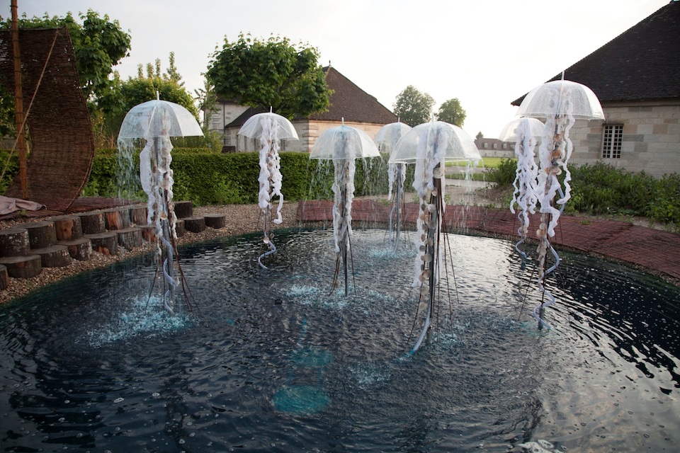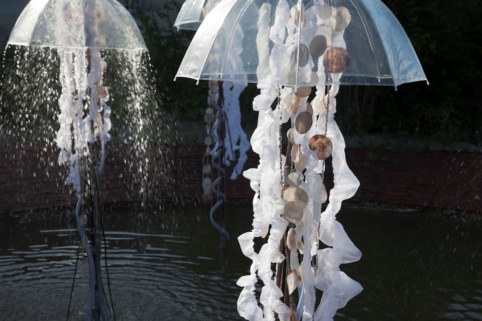 Parapluies, tissus, coquillages, Saule, Fers à béton, galets, rondins en bois, Fleurs annuelles et vivaces