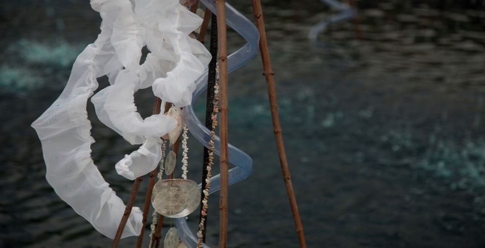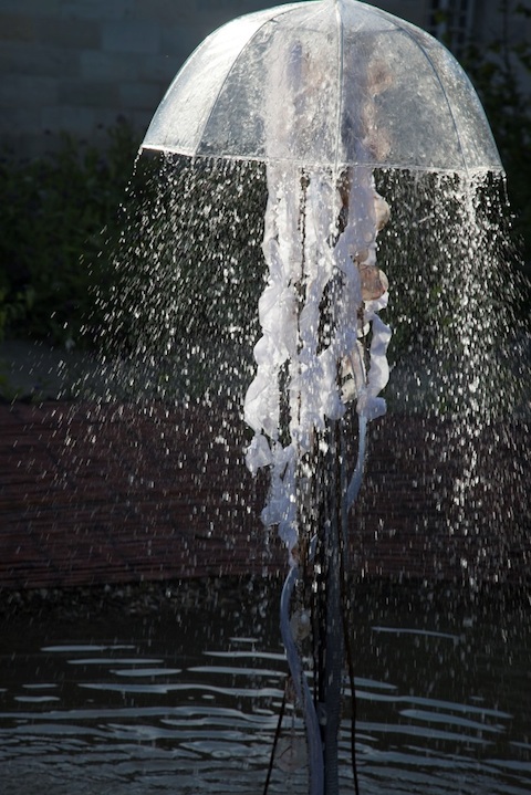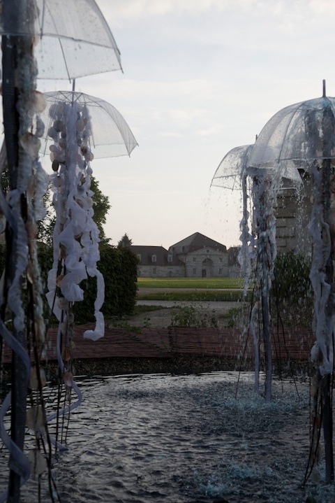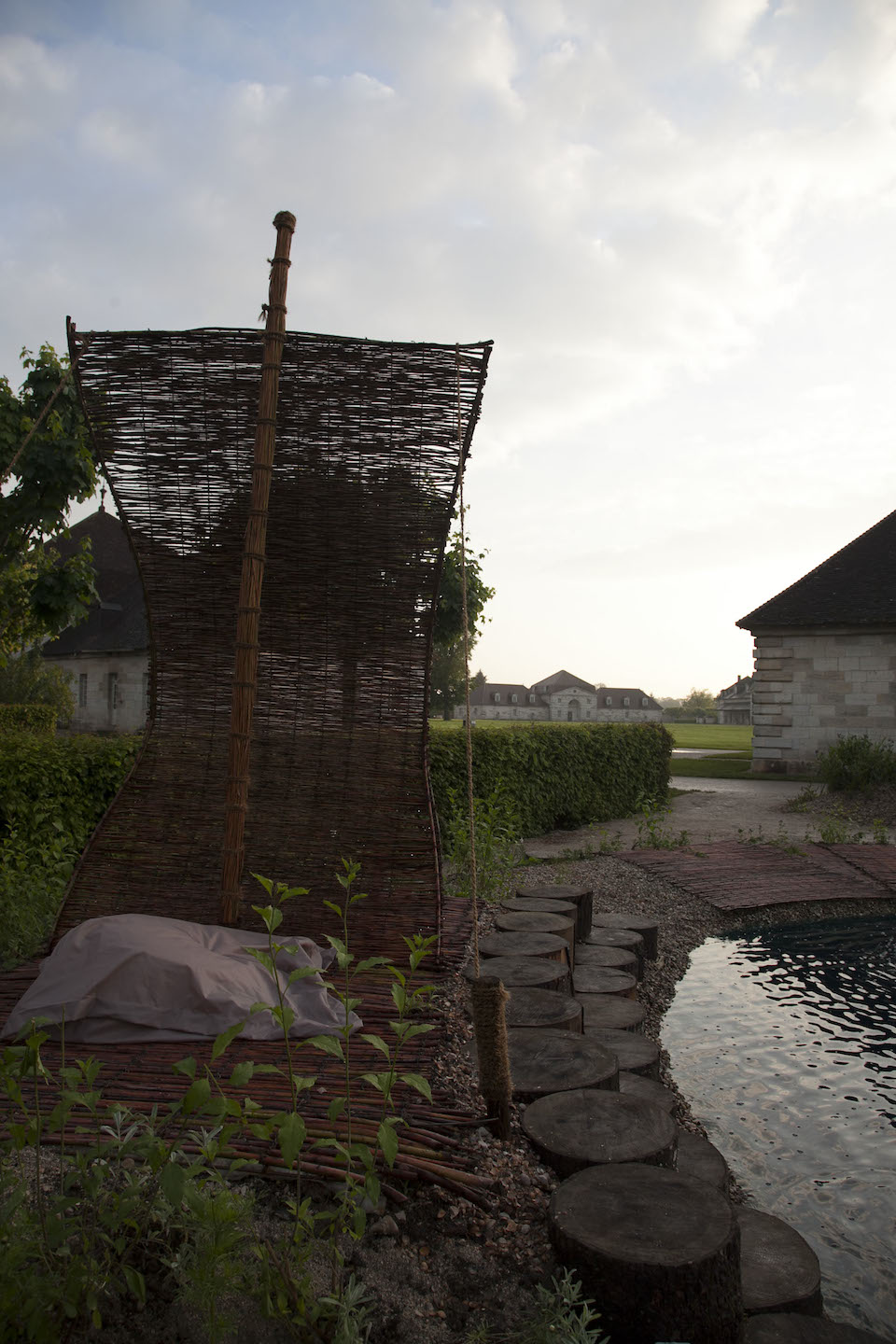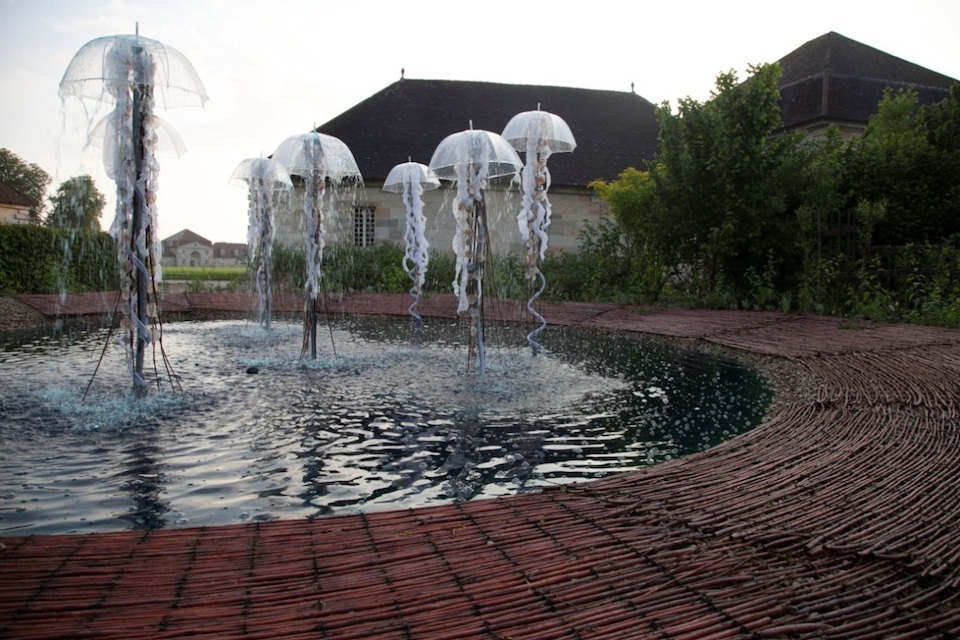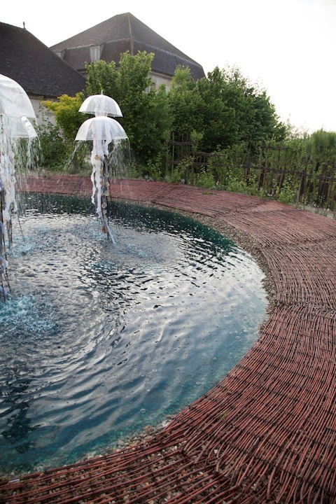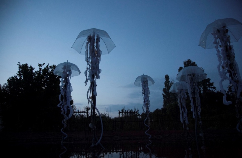 Parapluies, tissus, coquillages, Saule, Fers à béton, galets, rondins en bois, Fleurs annuelles et vivaces