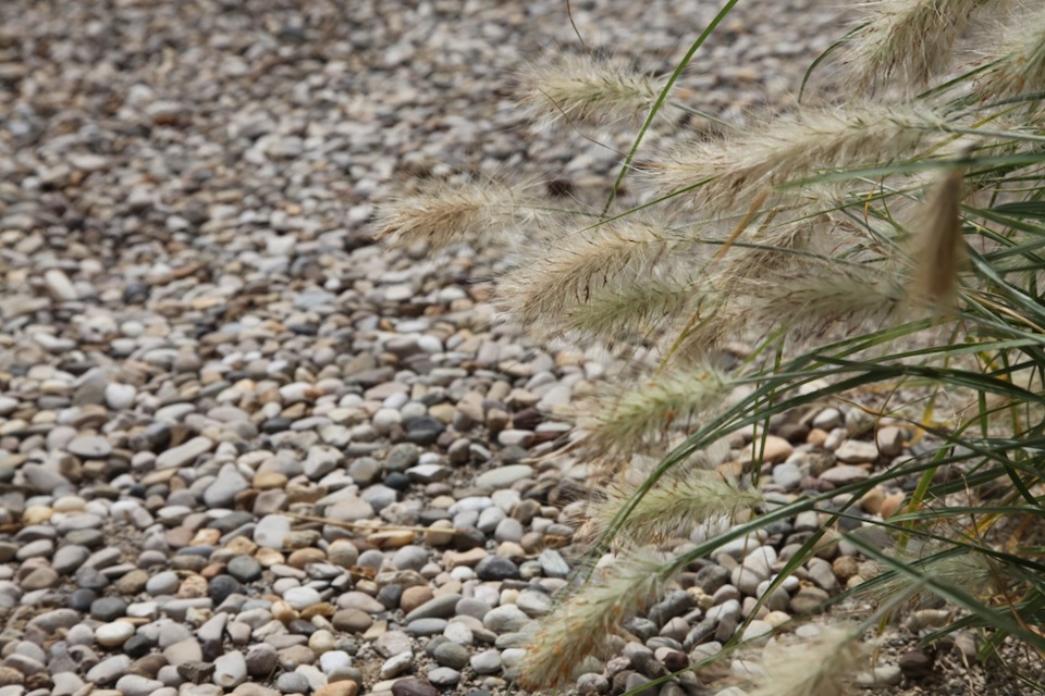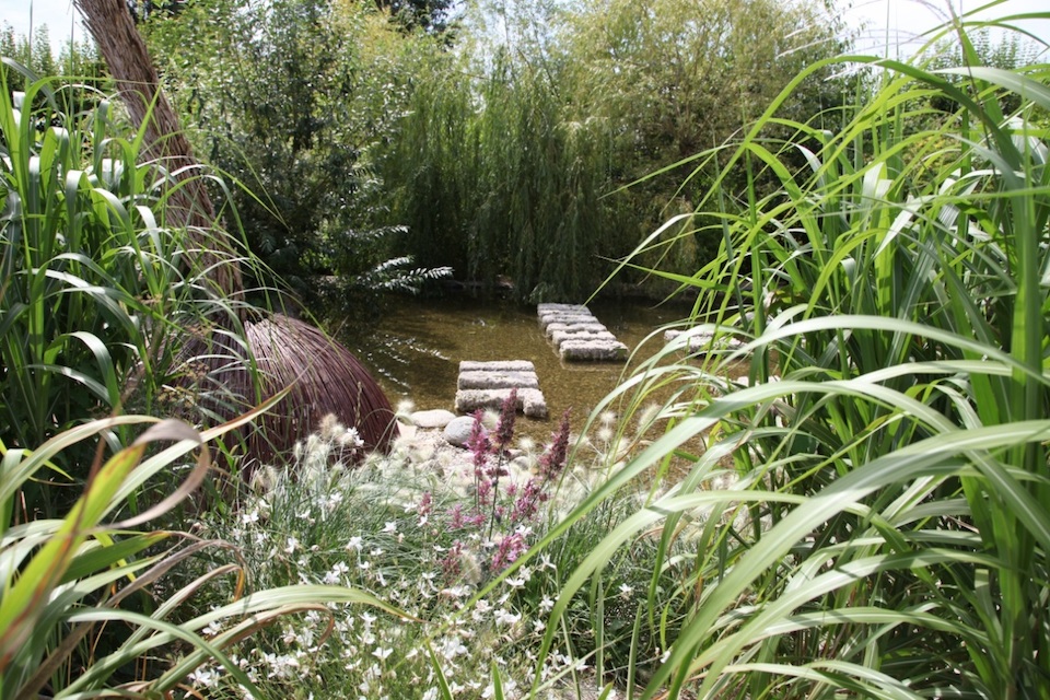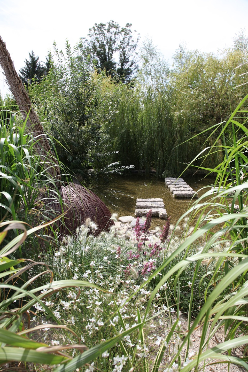 Bâche, galets, eau, sable, mousse, polyester, fers à béton, planches en bois. PLANTES : Penisetum vert, Gaura blanc, Sauge rose, Miscanthus vert, Saule vert, Peuplier vert et forêt de rive.