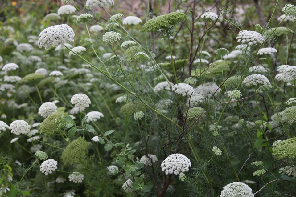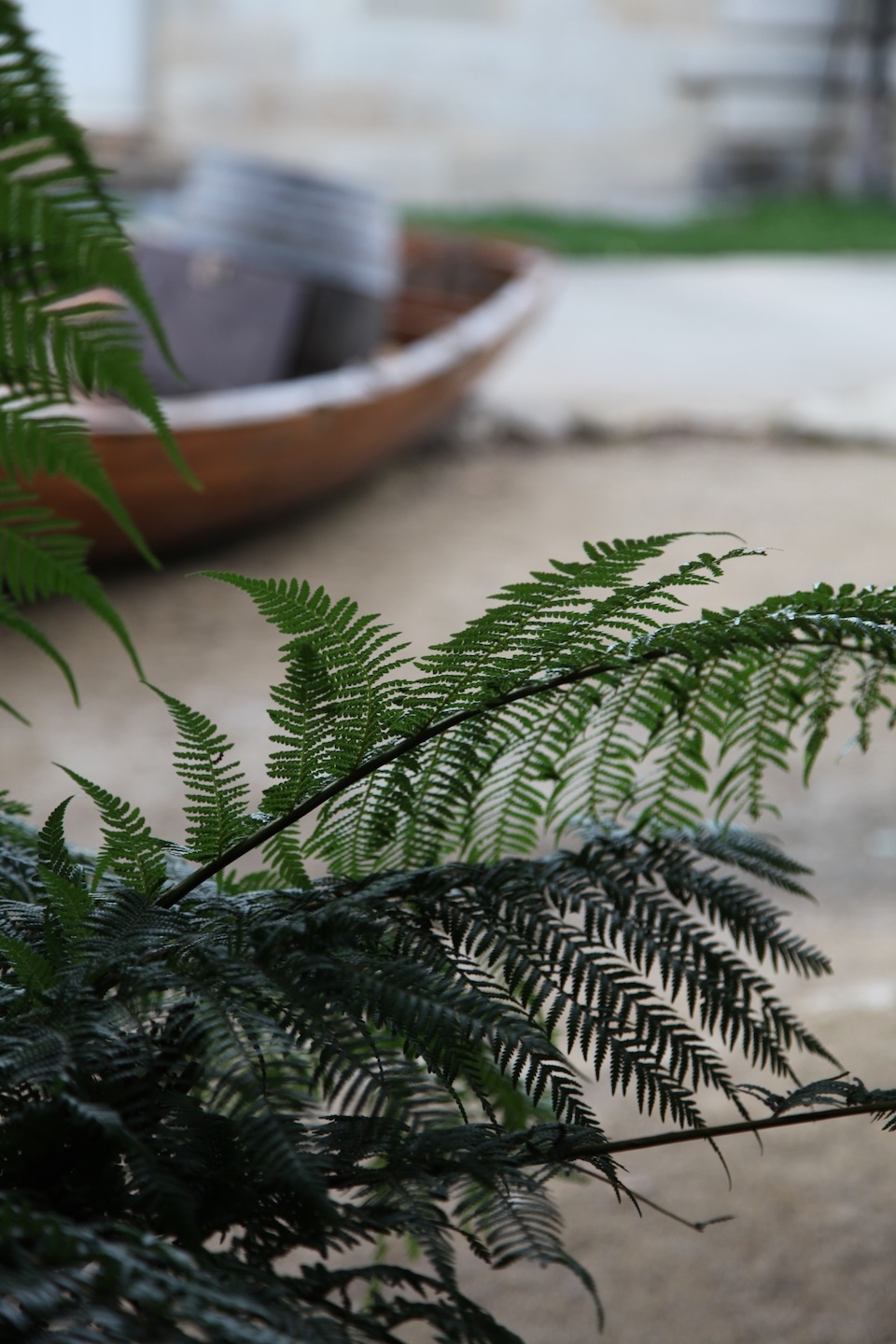 Forêt mixte, Fougères arborescentes vertes, Ricin rouge, Ombellifère blanche, Bleuet bleu, Miscanthus vert, Lierre vert.