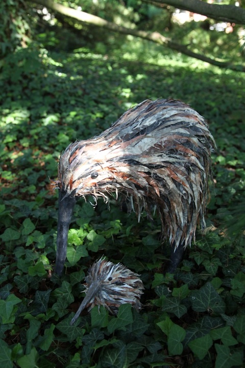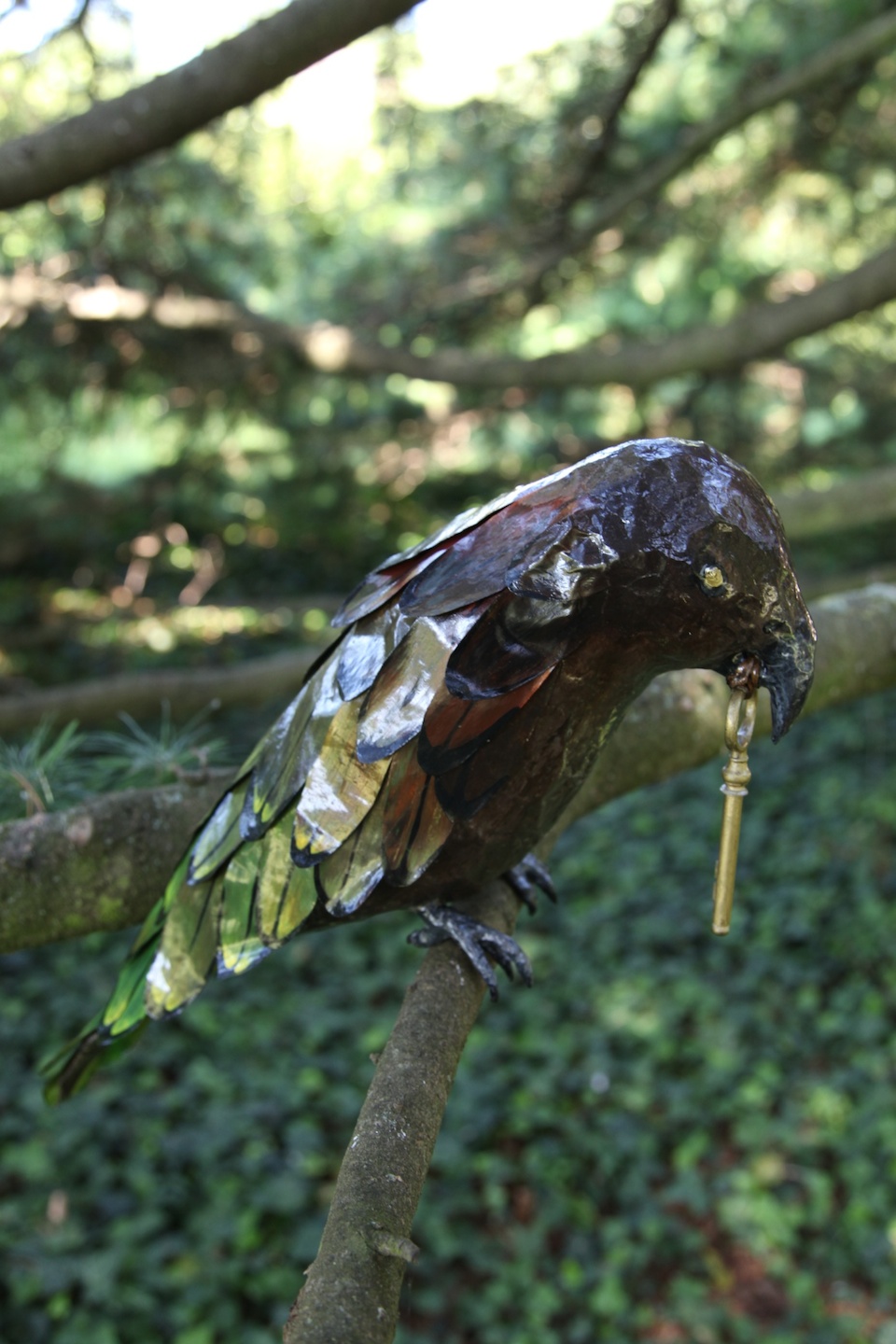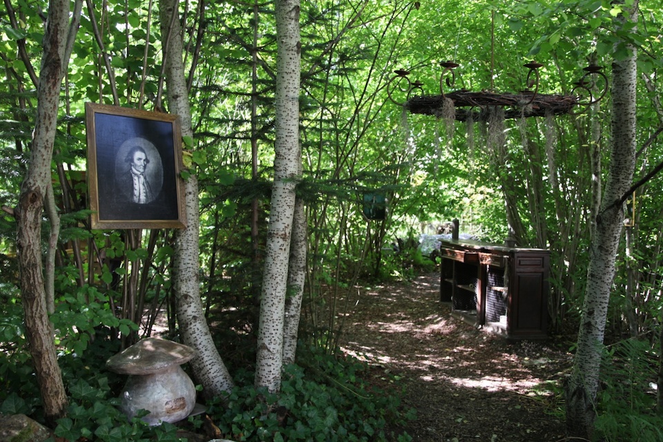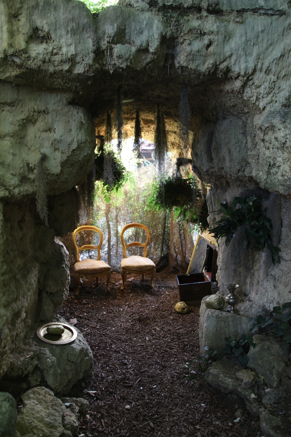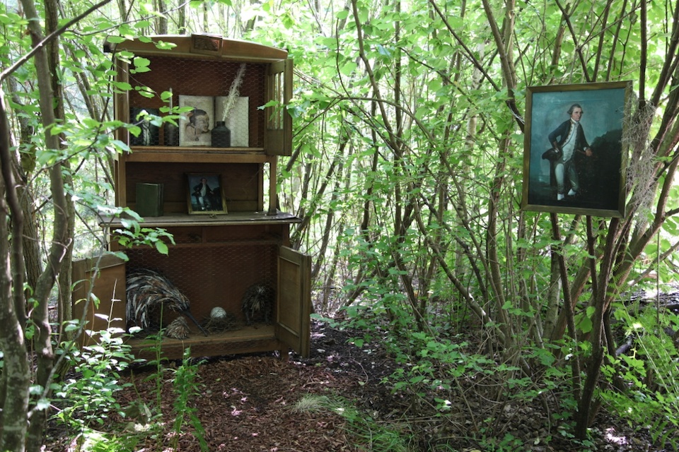 Sculpture en papier mâché Sophie Raemy, bateau en acajou, meuble en bois, chandelier, malle, cadre en bois, argenterie, copaux, pierres, bougies.