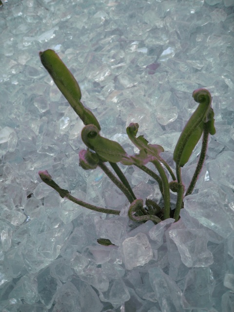 Un chemin suspendu entre terre et ciel nous guide à travers un petit forêt découvrant des cubes pris dans la glace emprisonnant des fougères suspendues et voyageant à travers les âges.