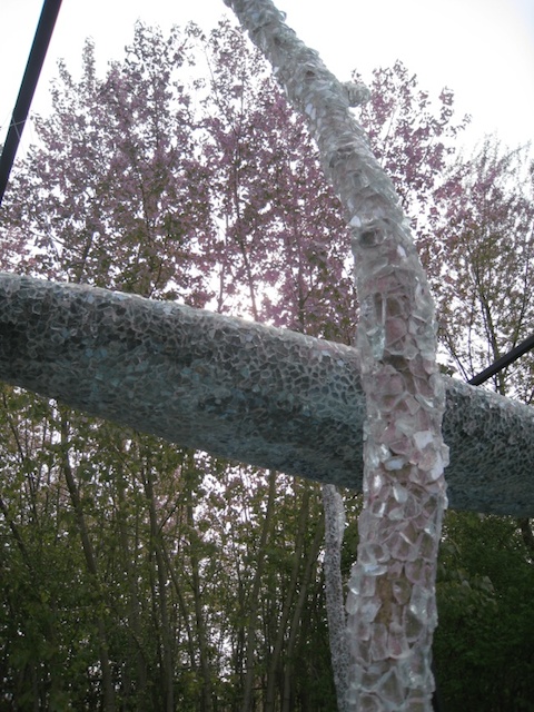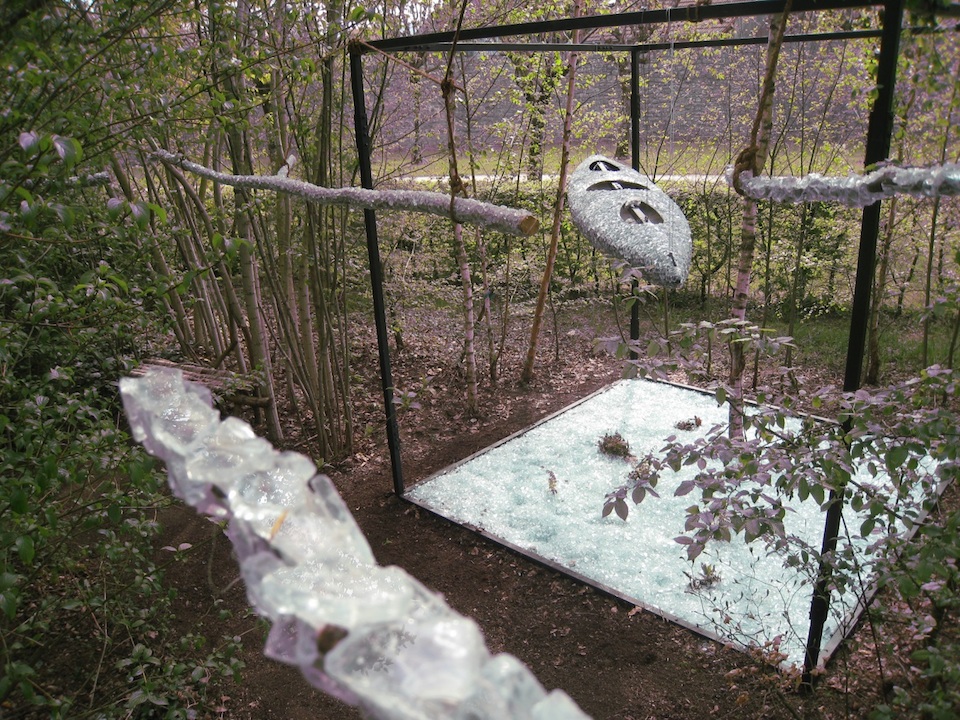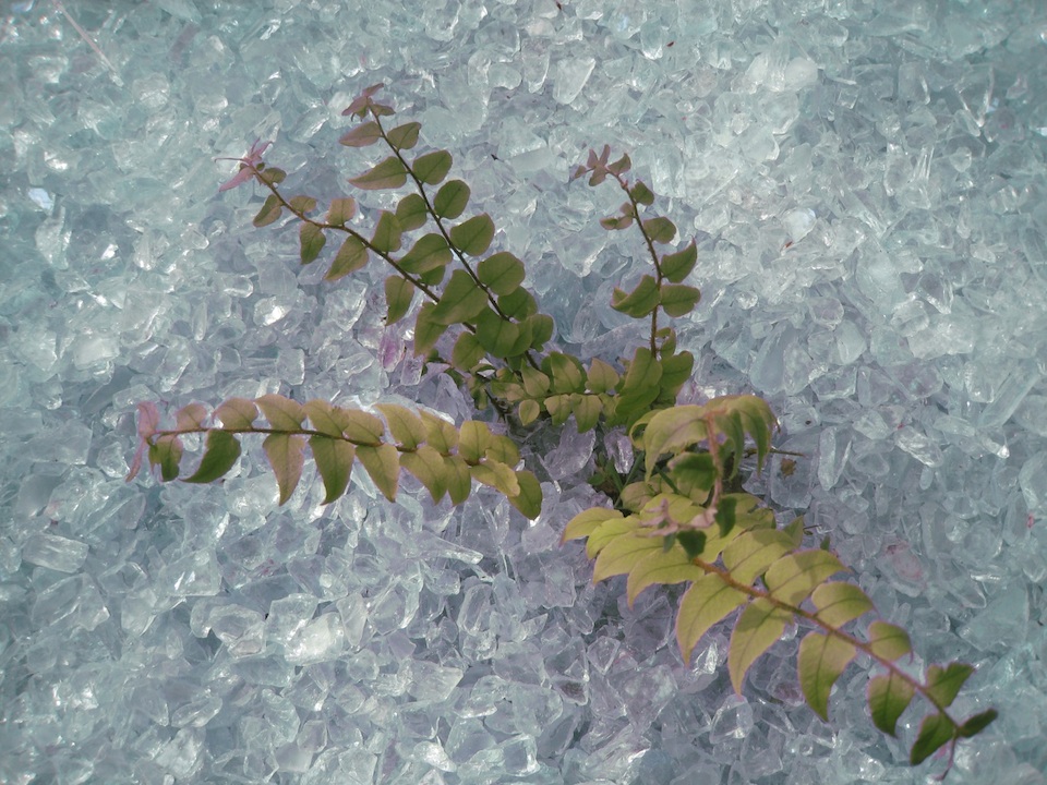 La glace est représentée par des débris de verre collés. Un débris, un fragment… nous le recomposant en le collant un à un pour en former une unité, un objet, une émotion.