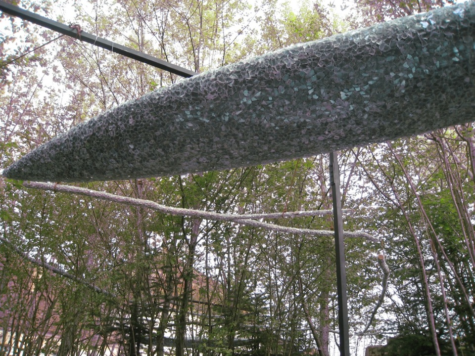Kayak en polyester, verre recyclé, Silicone, fers cubiques, câbles en acier, copaux, planches.
